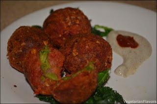 Now take a small ball, flatten it with you palms and fill in a small spoonful of the stuffing and them make them into balls. Repeat the procedure with the remaining mixture.